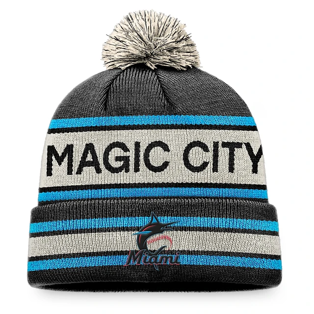 Bonnet en tricot à revers avec slogan Fanatics pour hommes, noir/naturel, Miami Marlins Hometown, avec pompon
