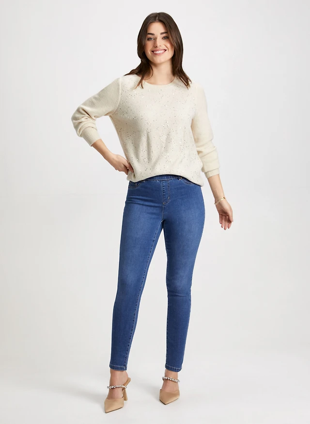 Veste courte en bouclé et jean à jambe étroite à détail de strass