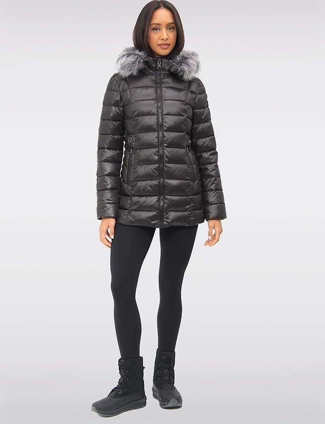 Manteau matelassé à capuche et jean clouté à jambe droite
