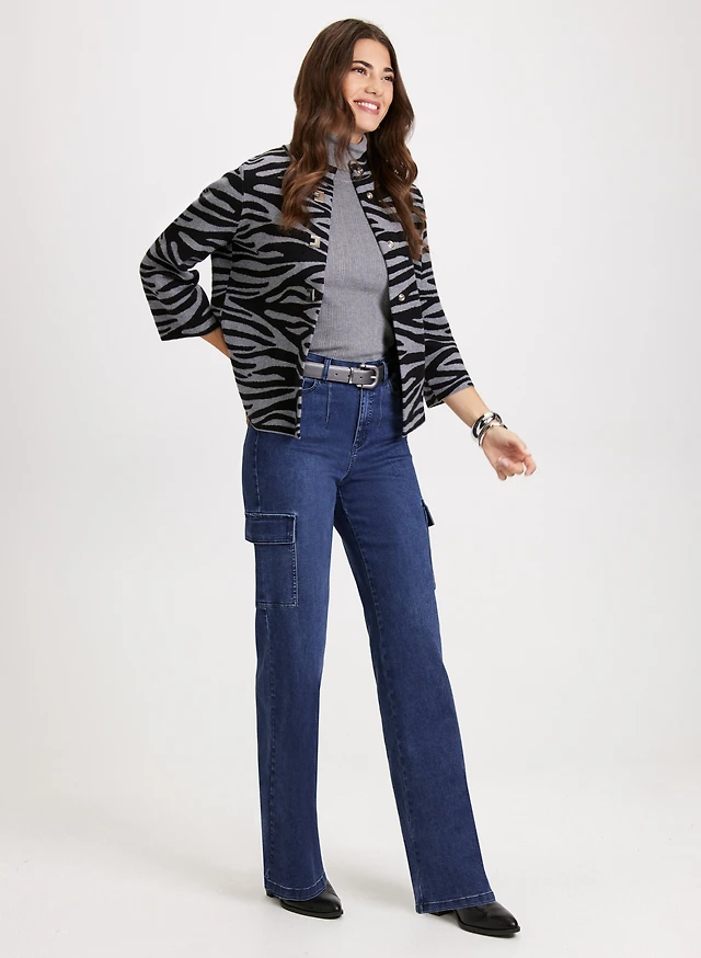 Cardigan à bordure léopard et jean à jambe évasée à fente