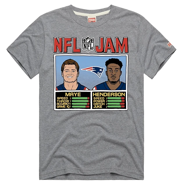T-shirt unisexe en mélange de trois matières, hommage à Rhamondre Stevenson, couleur anthracite, New England Patriots, avec un motif graphique joueur « Angry Runs ».