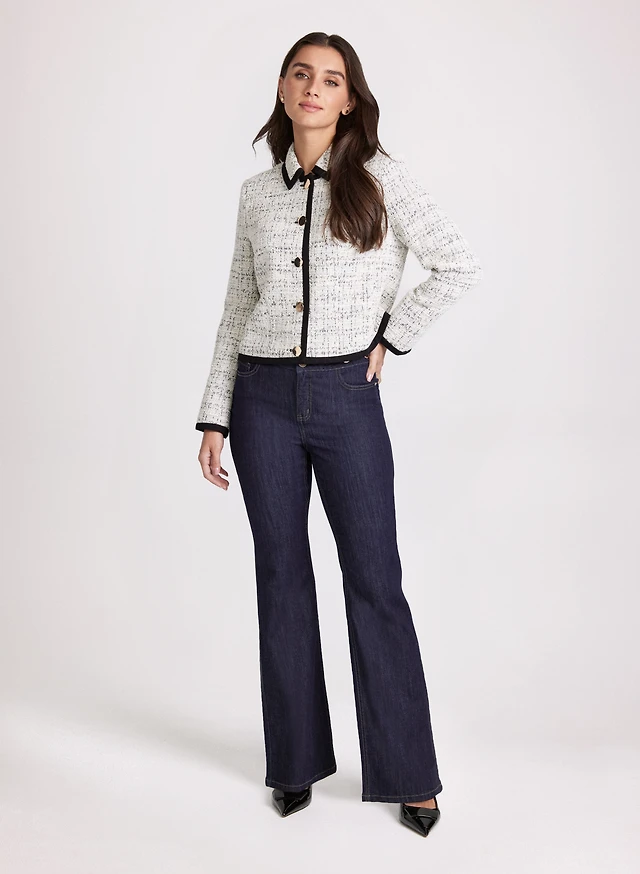 Veste en tweed contrastante et jean à jambe évasée