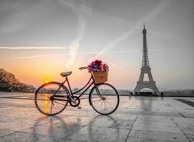 Assaf Frank - Bicycle with a basket of flowers next to the Eiffel tower, Paris, France