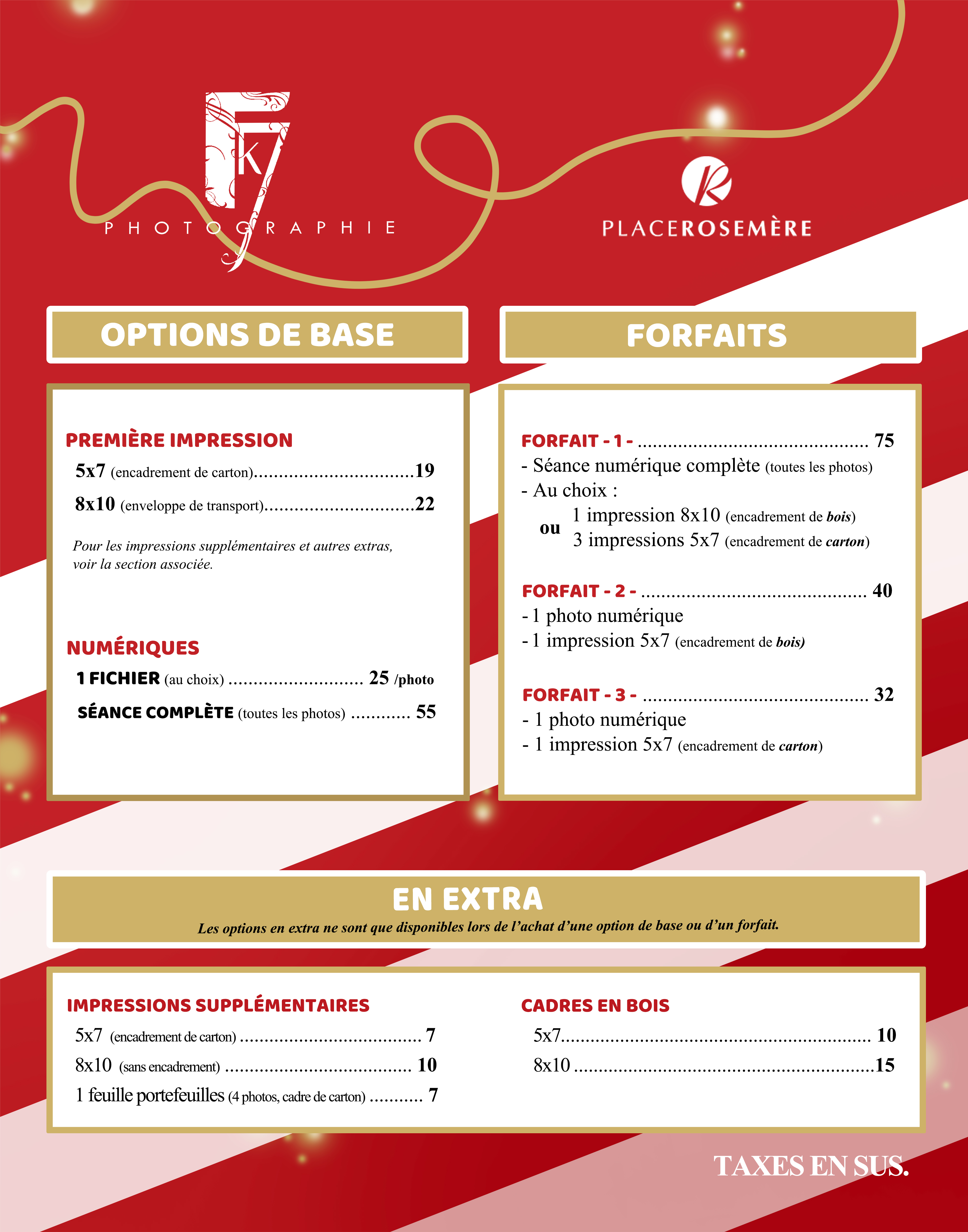 Votre visite avec le père Noël à Place Rosemère est entièrement gratuite. Vous pouvez prendre vos propres photos ou, si vous souhaitez conserver ce moment magique de façon professionnelle, vous aurez la possibilité d’acheter une photo souvenir de votre enfant avec le père Noël.